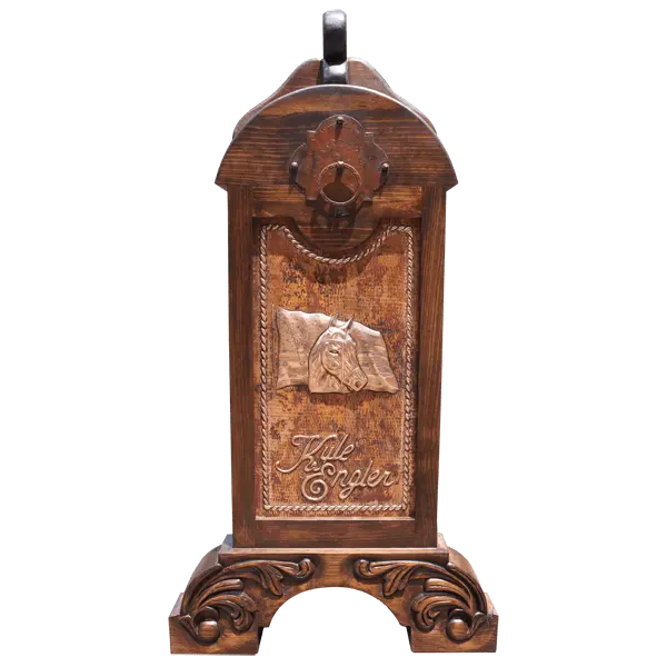 The front of the hand hammered copper panel of this handcrafted saddle stand is embellished with a tooled horse´s head with an American flag behind. Below the horse´s head is a tooled name, and the entire panel is bordered with a lasso design. Above the panel is a forged iron ring and plaque, and its solid wood base is carved with foliate and scroll designs. Our saddle stands are 100% customizable, including the finish and the decorative copper designs.